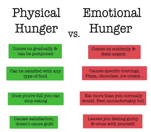 Another thing to understand is the differences between physical and emotional hunger. Physical hunger is what happens when we feel like we’re hungry. Emotional hunger is what happens when we think we’re hungry.