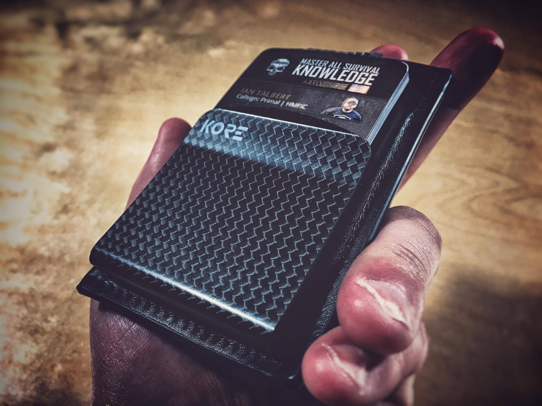 It features premium cowhide leather and a carbon fiber money clip that is removeable. This allows you to roll with the clip only, or combine them both for extra storage. I also found that you could use the back side of the carbon fiber clip to conceal some Escape and Evasion or Survival tools.