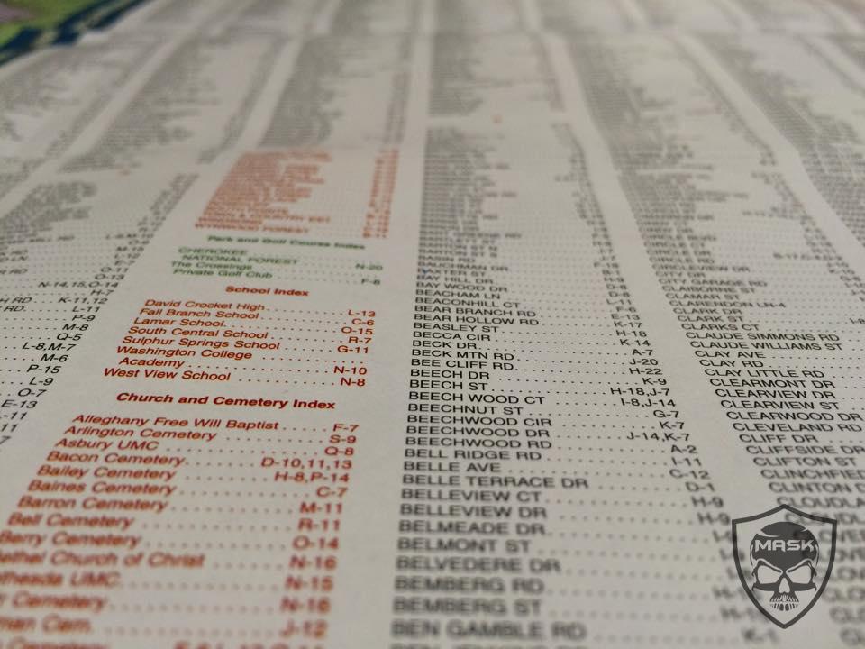 You can pick up standard Street Maps like these online, and even locally you can find them at cab businesses, real estate offices, and various other travel-based places. These street maps should have plenty of the above items already mapped out and organized for you in a key that corresponds to the quadrant of the map in which that item is located. This is key to save you loads of work. So make sure your maps have these.